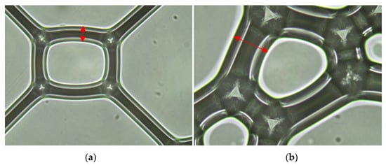 A foam surface could be observed immediately after the OM foam was produced. There are 32.48 μm of foam wall thickness in the diagram and 62.29 μm of foam wall thickness in the actual construction (Figure 7).