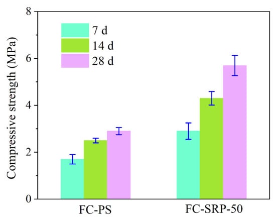 Figure 8 illustrates the effect of compressive strength on the experimental group (FC-SRP-50) and the control group (FC-PS). During the experiment, both the experimental and control groups showed an increase in compressive strength. Approximately 28 days after the experiment, the compressive strength of the experimental group exceeded that of the control group, which was 2.95 MPa. In conclusion, foam concrete prepared with SRP has a higher compressive strength than foam concrete prepared with PS.