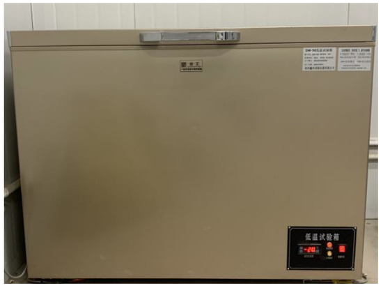 The DW-50 low-temperature box, produced by the China Cangzhou Xinxing Experimental Instrument Co. Ltd., is used to freeze the concrete at a low temperature, as shown in Figure 1. The test piece with a dry surface was gently placed in the low-temperature chamber to freeze. To ensure that the concrete test piece is fully frozen at the ambient temperature, the temperature was kept constant for 4 h after the internal temperature of the low-temperature chamber reached the target temperature (−10, −20, −30, or −40 °C). Thereafter, the test pieces were retrieved and measured to determine their mechanical properties, and the thickness of the damaged layer.