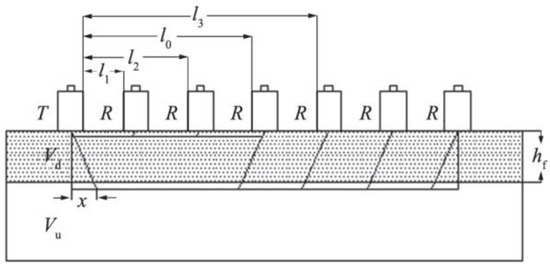 The ultrasonic testing of the concrete surface’s damaged layer is an indirect testing method. As per the basic principle of this method, sound waves travel at different speeds in the media with different densities, and the refraction and reflection occur when they pass through the interface of the media with different densities. When the concrete structure experiences early frost damage, the low temperature will gradually penetrate the concrete from the outside to the inside, which invariably causes varying degrees of damage on the concrete surface, thereby loosening the surface concrete and yielding damage layers of different thicknesses. For a large thickness of the concrete’s damaged layer, this parameter will affect the durability and bearing capacity of the concrete, so the ultrasonic test is an important parametric index in the concrete non-destructive testing technology [28]. In accordance with the single plane measurement method reported in the literature [29], the side of the prism test piece was tested. The installation method is illustrated in Figure 2. The transmitting transducer is placed 50 mm away from the edge, and the receiving transducer (R) is placed along the 100 mm × 400 mm side and equipped with 50, 75, 100, 150, 200, 250, and 300 mm ranging devices for troubleshooting. Finally, the sound time values of the different ranging devices are read. Vaseline is used as the coupling agent. The thickness of the damaged layer can be calculated using the following formula: