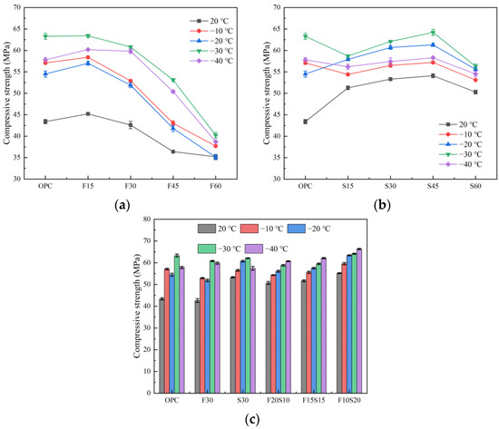 The results plotted in Figure 3c depict the compressive strength of the test piece under the condition of double mixing. Under the condition of the double mixing of fly ash and slag, the strength of the test piece increases with the increase in the amount of slag. When the fly ash-to-slag ratio is 1:2 (F10S20), i.e., when the slag content is 20% and the fly ash content is 10%, the compressive strength of the test piece attains its maximum value, and the strength under −40 °C reaches the peak value, which is 66.3 MPa. Compared with ordinary concrete, the compressive strength of the F10S20 group is higher than the OPC at other temperatures, except that the strength after −30 °C is slightly lower than that of the ordinary concrete. Compared with the single fly ash and single slag mixing, F20S10 and F15S15 offer no obvious strength advantages after a low-temperature exposure; on the contrary, they even exhibit an insufficient strength at certain temperatures. The compressive strength of the F10S20 group after exposure to different low temperatures is greater than that of F30 and S30, thereby validating that the proper addition of slag can greatly improve the density of the fly ash concrete; this strategy achieves the purpose of improving the strength of the concrete. In addition, in contrast to the single mixing rule, the strength of the concrete under the combined mixing strategy increases with the decrease of strength.