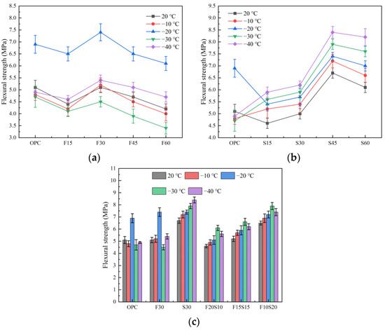 Figure 4c depicts the compressive strength of the test piece under the condition of double mixing. Observably, under the condition of the double mixing of fly ash and slag, the strength of the test piece increases with the increase in the amount of slag. When the fly ash-to-slag ratio is 1:2, the flexural strength of the F10S20 group attains its maximum value, and −30 °C is the optimal temperature for the compound mixing. At this temperature, the flexural strength of the F10S20 group is 7.9 MPa, followed by those at −40, −20, and −10 °C. The evident difference from the change rule of the compressive strength is that the F20S10 and F15S15 groups do not offer obvious strength advantages after a low-temperature exposure compared with the single fly ash (F30), and even the strength at certain temperatures is insufficient. However, regardless of the proportion in which the fly ash and slag is mixed, the flexural strength of the concrete at different low temperatures is lower than that of the concrete with only slag (S30). Accordingly, the effect of the mixed fly ash and slag on the flexural strength of the concrete after a low-temperature exposure, is not as desirable compared to that of the concrete with only slag.