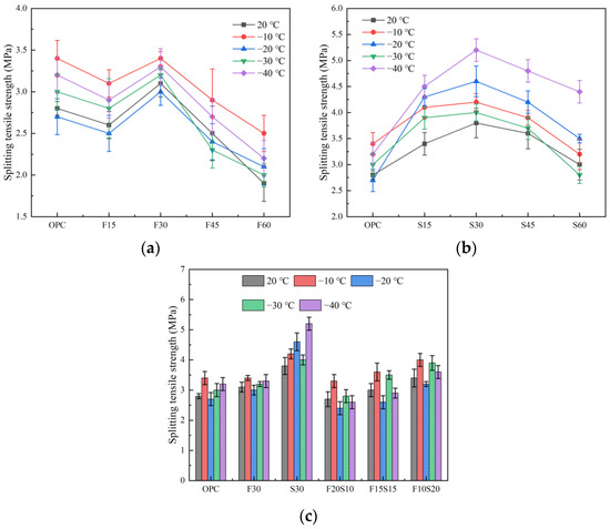 The splitting tensile strength of the concrete mixed with fly ash and slag is illustrated in Figure 5c. The bending strength of the specimen increases with the increase of the slag content, but when the ratio of the fly ash-to-slag is 2:1, the splitting tensile strength of the F20S10 group at different temperatures is lower than that of the OPC, F30, and S30. When the slag content reaches 20%, although the splitting tensile strength of F10S20 after a low-temperature treatment is improved, rendering it greater than that of the OPC and F30, its strength is still lower than that of S30. The splitting tensile strength at 20, −10, −20, −30, and −40 °C is only 89.5, 95.2, 69.6, 97.5, and 69.2% of S30, respectively. In addition, regardless of the proportion of the fly ash and slag used, −10 °C exerted the most obvious effect on the splitting tensile strength of the concrete, followed by the improvements offered by −30, −40, and −10 °C.