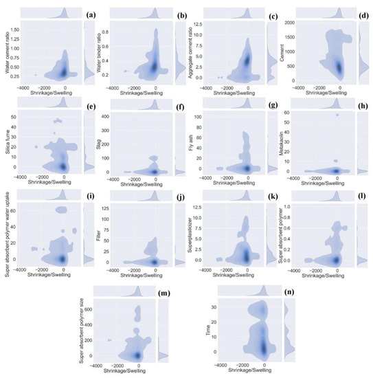 The database required for the prediction of autogenous shrinkage was accumulated from published literature and the NU database, incorporating supplementary cementitious materials and SAP [34,100,101,102,103,104,105,106,107,108,109,110,111,112,113,114,115,116,117,118,119,120,121,122,123,124,125,126,127,128,129,130,131,132,133,134,135,136,137,138,139,140,141,142,143,144,145,146,147,148] (see Supplementary File S1). A total of 1889 data points are extracted on different days ranging from one to twenty-eight days. The variables used in forecasting autogenous shrinkage are comprised of fourteen inputs including water-cement ratio, water binder ratio, aggregate-to-cement ratio, silica fume (% cement mass), cement content (kg/m3), slag content (% cement mass), fly ash (kg/m3), metakaolin (% cement mass), superplasticizer (% cement mass), filler content (kg/m3), SAP content (% cement mass), SAP water uptake (g/g of SAP), SAP size (µm), and curing time (days). Moreover, the RH of the data ranges between 20 to 98%. As the data gathered mostly includes waste materials, thus the main focus is to make a predictive model using the aforementioned variables. The data description and frequency distribution of the variables is shown in Table 2 and Figure 1.
