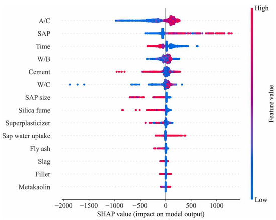 The Shapley Additive explanation (SHAP) gives both internal and external explanations of every input variable in this investigation. SHAP delivers equivalent information to the widely used feature significance metric but is better suitable for collective machine learning techniques since it is more robust and gives quantitative and qualitative information. Figure 12 displays the SHAP scores of each attribute, ordered by their mean SHAP value. The characteristics shown at the top of the pictorial depiction are connected with the largest model output contributions. The characteristics that influenced shrinkage forecasts the most were the aggregate-to-cement ratio (A/C), the SAP content, time (days since the commencement of shrinkage measurements), water-to-binder ratio, amount of cement, water-to-cement ratio, SAP size, and silica fume concentration. For each of these parameters, there is a distinct dividing line between high and low effects on model output: high A/C ratio increases SHAP value, which decreases shrinkage; high SAP content decreases shrinkage and was discovered to be the greatest important variable; high time values necessarily correlate to higher shrinkage values; high w/b and w/c tend to decrease shrinkage, whereas high silica fume replacement ratio or cement content generally induces higher shrinkage, and big SAP size reduces SAP positive effect and enhances shrinkage compared to smaller SA. These impacts are consistent with the results of experiments. It was determined that superplasticizer, fly ash, slag, filler, and calcined clay content had the least influence. These SHAP-based results are compatible with the experimental measurements, as these factors are known to have a negligible effect on shrinkage.