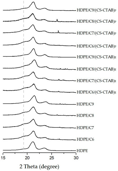 X-ray diffraction pattern of HDPE, HDPE/CS, and HDPE/CS/(CS-CTAB).
