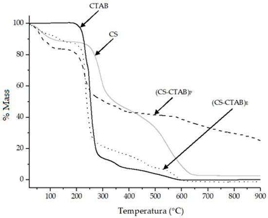 Figure 2 shows the TG curves for chitosan (CS), organic salt (CTAB), and chitosan functionalized with quaternary ammonium salt by two different methods, evaporation, and precipitation (CS-CTABE and CS-CTABP). Pure chitosan shows three events of mass loss. The first event occurs at an initial decomposition temperature (Ti) of 52 °C and refers to the water loss associated with the amino groups in the polysaccharide structure. The second event takes place at around 263 °C and is altered by the decomposition of organic matter that begins with the breakdown of glycosidic bonds accompanied by the decomposition of the acetylated and deacetylated units of the polymer. The third event occurs in a Ti of approximately 498 °C, resulting from the decomposition of the polymer residues [57,58].
