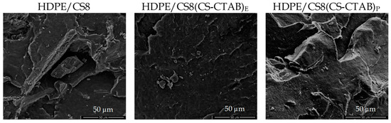 SEM images of HDPE/CS8, HDPE/CS8/(CS-CTAB)P and HDPE/CS8/(CS-CTAB)E.