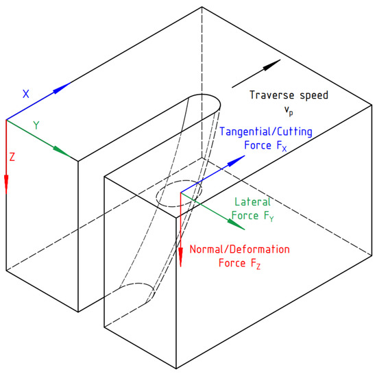 When talking about exerted forces, we recognize three components. Those components denoted in the Cartesian system are forces in x-, y-, and z-axes. Force in the x-axis, called the tangential force (TF), acts in the direction of the traversal speed. Force in the y-axis, called the lateral force (LF), acts in the same plane perpendicularly to the tangential force. Force in the z-axis, called the normal force (NF), usually acts in the direction of the flow of the water jet and it is perpendicular to both the tangential and the lateral force. The tangential force should coincide with the cutting force (CF). The lateral force values usually vary around 50–100 times lower than those of the tangential force [25]. The normal force corresponds with the deformation force (DF). The directions of the exerted forces are sketched in Figure 1.
