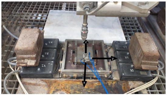 The selected materials were machined to have the same dimensions: 90 × 90 × 20 mm. A round 6 mm diameter hole was drilled into them. This hole was used to screw the holder with the accelerometers to the sample for measuring its vibrations. Three 352C33 accelerometers made by PCB Piezotronics (Depew, NY, USA) were used to measure vibrations in the three axes of the Cartesian system. To measure forces in the identical axes, the patented force sensor [26] was used. The sample was tightly attached to a metal plate that was then inserted into the sensor frame. The used setup and axes can be seen in Figure 2.