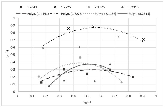 To test the theorem, four samples—steel 1.4541; steel 1.7225; bronze 2.1176; duralumin 3.2315—were selected. The values of the measured forces can be seen in Table 6, whereas their ratio is presented in Table 7. Respective data are plotted on a graph in Figure 4 and interleaved with a second order polynomial curve. The uncertainty of the measurement was up to 5%.