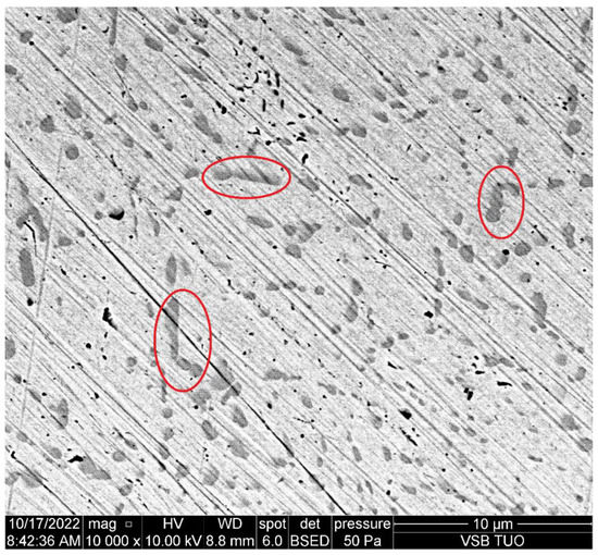 Restricting Table 5 to the tested steels (Table 8, Figure 5), Table 9 presents only the important elements—carbon and chromium. It can be seen that the steel 1.4845 with the highest percentage of chromium also has the highest force in the z-axis. This is caused by a higher number of small carbides influencing the deformation mode of the material removal. On the other hand, the steel 1.7225 with the lowest percentage of chromium inside shows the lowest z-axis force. The similarity in the measured forces on steels 1.2379 and 1.4541 can be caused by a compensation of the higher percentage of chromium by the lower percentage of carbon and vice versa. Forces in the x-axis seem to be less dependent on the structure, and more research needs to be done in this area. Figure 6 shows the carbides in the 1.4034 steel.