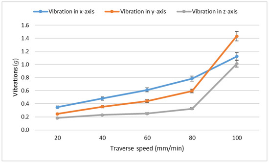 From the results in both the tables and the figures, it can be seen that the vibrations and the exerted forces really increase with the increasing traverse speed. The rapid growth of values at the speed 100 mm/min might be attributed to the slight hitting of the support grid, on which the force sensor was situated, by the residual abrasive water jet. The reflected jet impacts the support with the steel sample, thus increasing both the vibrations and the measured forces. However, the functional dependency of the forces and vibrations on the traverse speeds strongly resembles the dependencies for the declination angle presented in the article [37].