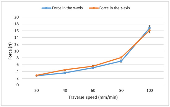 Forces in the x- and z-axes in relation to the selected materials and the traverse speeds.