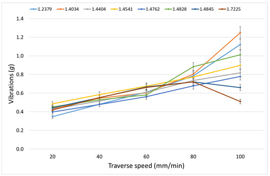 Measured vibrations in relation to the traverse speed on the steel 1.2379.