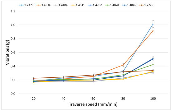 Vibrations measured in the x-axis in relation to the respective steel and the traverse speed.