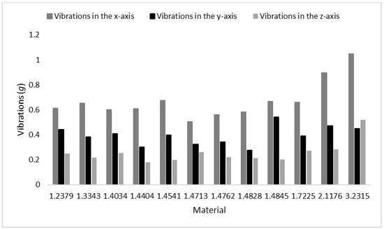 Vibrations were measured for the different types of steel materials using the identical traverse speed for all of them (60 mm/min) and the higher speeds for the bronze (90 mm/min) and the duralumin (160 mm/min). The traverse speeds were selected so that the expected declination angle [37] was similar to the one on steels. Measured results are listed in Table 15 and plotted in Figure 11.