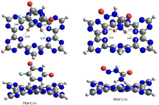 Fluorouracil and nitrosourea were relaxed over C6N6 in different orientations to obtain the most stable Drug@C6N6 complexes for effective drug delivery at a specified target. The resultant most stable geometries of the Drug@C6N6 complexes are reported in Figure 2, while the less stable complexes of Drug@C6N6 are shown in the Supplementary Materials (Figure S1). Furthermore, the energies of the most stable Drug@C6N6 complexes are provided in Table 1, whereas all others are given in the Supplementary Materials (Table S1).