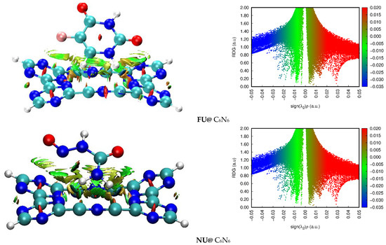 Three-dimensional isosurfaces and 2D RDG plots of FU@C6N6 and NU@C6N6 complexes at iso value of 0.002 a.u.