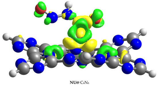 NBO and EDD analyses give valuable information about charge transfer in interacting systems. The magnitude of the charge transfer between the drug and C6N6 was explored through NBO analysis. The EDD was calculated by subtracting the sum of the drug and C6N6 charges from the charges of the Drug@C6N6 complex. The isosurfaces resulting from the EDD analysis consisted of two colors: green and yellow. The green isosurfaces indicate the accumulation of electron density, whereas the yellow surfaces show the depletion of electron density. So, the existence of both types of isosurfaces reveals the exchange of charges between the drug and C6N6. The isosurfaces executed through the EDD analysis are given in Figure 5. However, the values of charges obtained by the NBO analysis are shown in Table 3.