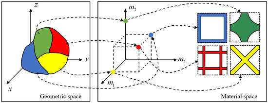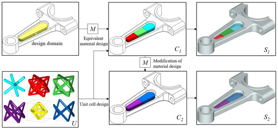 The CAD models of lattice structure are usually converted into STL files. Therefore, it is less convenient for designers to capture the design intents. Firstly, for the design process of the LMC, the ideal design should be optimized for performance based on the specific functional requirements. Then, each sub-design domain obtains the optimal material distribution such as elastic modulus [24,25], Poisson’s ratio [26], shear modulus [27] etc. Finally, the unit cell configuration is chosen based on macroscopic material distribution. The ideal design process for the LMC is shown in Figure 1. The corresponding CAD model needs to reflect the ideal design process of the LMC and not just the discrete geometric information.
