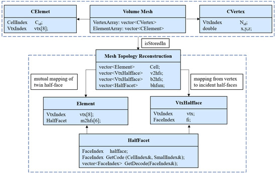 Based on the above topological conventions, the CAHF data structure oriented to finite non-manifold characteristic is proposed as shown in Figure 5. Volume meshes contain element connectivity and node coordinates. The element connectivity and node coordinates are used as input. These are stored in Class Element. Class Element also opens a one-dimensional array that stores the twin half-face of each face in the element. Class HalfFacet is an encoding and decoding operation for half-face information. Class VtxHalfface is used to store the topological relationships by Mesh Topology Reconstruction.