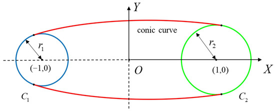 The symbols are defined as, and . As the circles are tangent to the curve, we can calculate two parameters of the curve equation. Thus, we take C1 as an example from (2) and (4). Depending on Equation (6) obtained by the union, its discriminant will be zero. Therefore, we achieve: