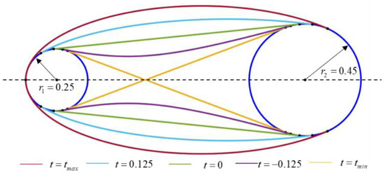 As shown in Figure 11, the strut shapes controlled by the offset parameter t are discussed based on the given two circles. The maximum and minimum values of the offset parameter can be calculated as follows. When the tangency points are on the x-axis, the value of t will be the maximum. The maximum value of t can be calculated from (11).