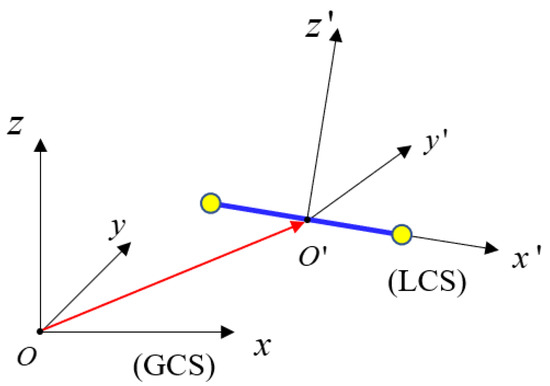 Next, the model is scaled, rotated and translated in sequence from (16). These operations realize the transformation from the local coordinate system to the global coordinate system (GCS), as shown in Figure 12.