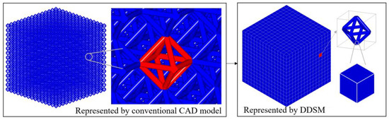In this section, the three benefits of the DDSM model will be discussed over the STL format. Firstly, the DDSM contains dual-material information in addition to geometric information. The STL file format represent only the geometric information of the model. Therefore, it is difficult to complete material evaluation through geometric information. In the dual-scale framework, as shown in Figure 14, the lattice structure can be viewed as volume meshes at the macroscopic scale. The CAHF data structure constructs the CAD model with complete topological relationships, which helps the equivalent material query. Moreover, the equivalent material property of unit cell takes the CAD model down from the macroscopic scale to the microscopic scale. The microscopic CAD model includes information on the geometry and manufacturing materials of the unit cell. The implicit representation can answer the question of whether the manufacturing material exists at the geometric points.