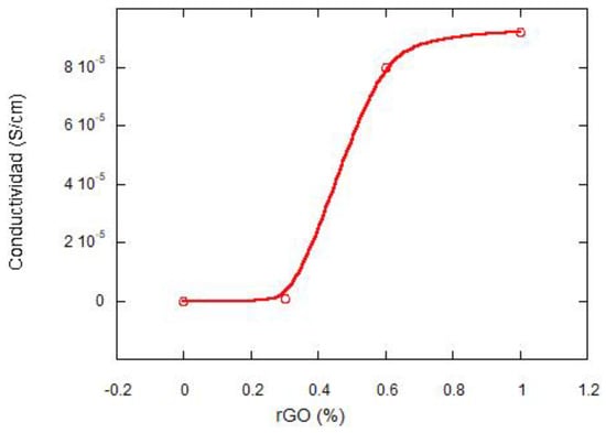 Figure 3 shows the variation in electrical conductivity as a function of rGO content. PLCL is an insulating polymer, but when rGO is added, the electrical conductivity increases significantly. The polymer undergoes a rapid transition from insulator to a more conductive material (typical percolation process). This is due to the formation of multiple conductive networks in the reduced graphene oxide. The so-called percolation threshold is the critical value at which an abrupt transition in conductivity occurs with a slight increase in the concentration of the conductive charge [20,21]. The value of the percolation threshold is low (0.4 wt%). This value is related to the properties of the composite materials; that is, high electrical conductivity of rGO (80 Scm−1), fairly uniform dispersion, and large size of the graphite sheets [22,23].