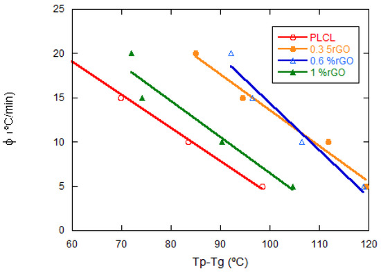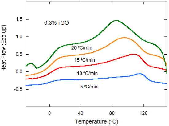 According to the obtained experimental results, Table 2 shows how, at all of the tested speeds and for the same rGO composition, the temperature of the nonisothermal crystallization peak (Tp) decreases as the cooling speed increases. The evaluation of the influence of the rGO concentration at all of the tested speeds (Figure 5) shows that the Tp increases with the addition of rGO, regardless of the amount incorporated.