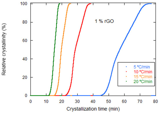 where Tc is the temperature at crystallization time, To is the initial crystallization temperature, and Φ is the cooling rate. The integration of the (exothermic) crystallization peaks during the nonisothermal crystallization process allows to obtain the relative crystallinity versus crystallization time for cooling rates of 5, 10, 15, and 20 °C·min−1 (Figure 7). It is observed that the crystallization time increases with the decreasing cooling rate. For example, the PLCL/rGO 1 wt% samples needed 7 min to complete the crystallization process at a fast cooling rate of 20 °C·min−1. However, 30, 19, and 11 min were used for rates of 5, 10, and 15 °C·min−1, respectively.