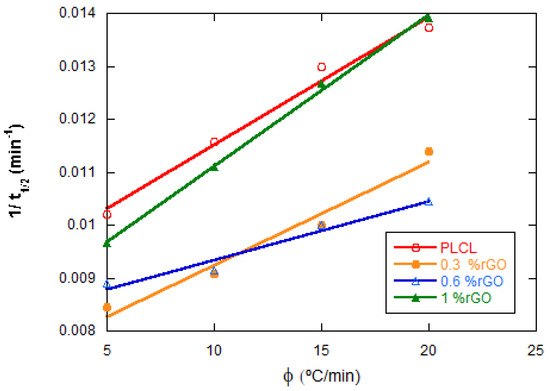 To quantitatively evaluate the effect of rGO on the crystallization rate, the CPR parameter [27,28,29,30], which is the crystallization rate parameter of the polymer, has been proposed. The CRP can be calculated from the slope of the lines representing 1/t1/2 versus the cooling rate (see Figure 8). A higher slope value would indicate a higher crystallization rate. The values obtained were 0.991 for PLCL and 0.985, 0.980, and 0.999 for its compounds with 0.3, 0.6, and 1 wt% of rGO, respectively. The values obtained for CRP are very similar for all composites.