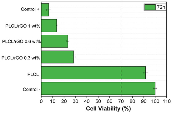 All of the samples were also evaluated with respect to their cytotoxicity to understand their possible potential for biomedical applications. The cytotoxicity of PLCL and PLCL-rGO samples was evaluated, according to the ISO standard 10993-5, with myoblast cells (C2C12), and the results obtained after 72 h are shown in Figure 9.