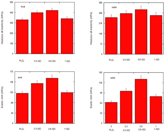Compressive modulus of elasticity and elastic limit under compression, in the axial and radial direction, for scaffolds made with 0, 0.3, 0.6, and 1% rGO.