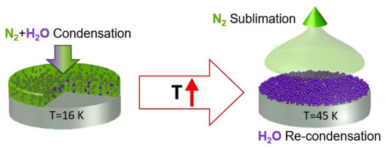 The components of ice, which are mixtures of different gases, have different sublimation temperatures, which, when the temperature rises, can lead to drastic changes in their structure. For example, for a two-component sample, when the temperature reaches above the sublimation temperature of one of the components of the mixture, it will evaporate, resulting in recondensation of the second component on the substrate. A schematic diagram of the recondensation process is shown in Figure 1.