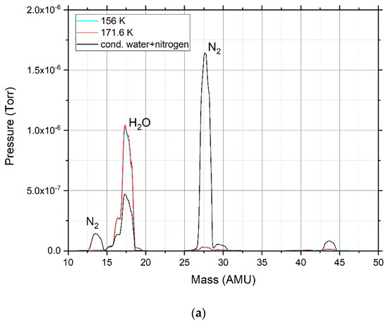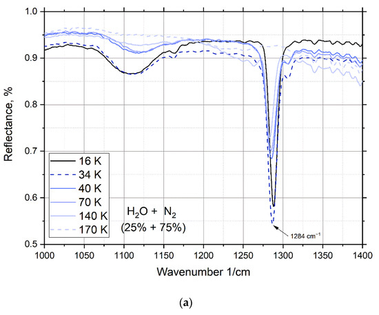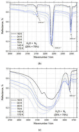 At a water concentration of 25%, peaks appear (Figure 6a—1284 cm−1; Figure 6b—2149, 2228, and 2340 cm−1), which disappear after heating to 170 K. In Figure 2, the mass spectrum is recorded in the chamber, which confirms which substance creates this peak. As can be seen from Figure 2a, after heating the sample contains only water, and nitrogen is completely sublimated at a temperature of 171.6 K. This proves that these peaks are formed under the action of nitrogen in the composition of the mixture.