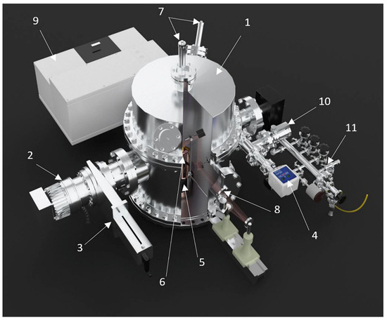 The main unit of the experimental setup (see Figure 3) is a high vacuum chamber which generally works at 0.01–1 μTorr. The continuous pumping process is carried out by a Turbo-V- turbomolecular pump (Agilent, Santa Clara, CA, USA) in combination with an SH-110 dry-scroll vacuum pump (Agilent, Santa Clara, CA, USA). Pressure measurement is carried out by the FRG-700 converter (Agilent, Santa Clara, CA, USA) with an AGC-100 controller (Agilent, Santa Clara, CA, USA).