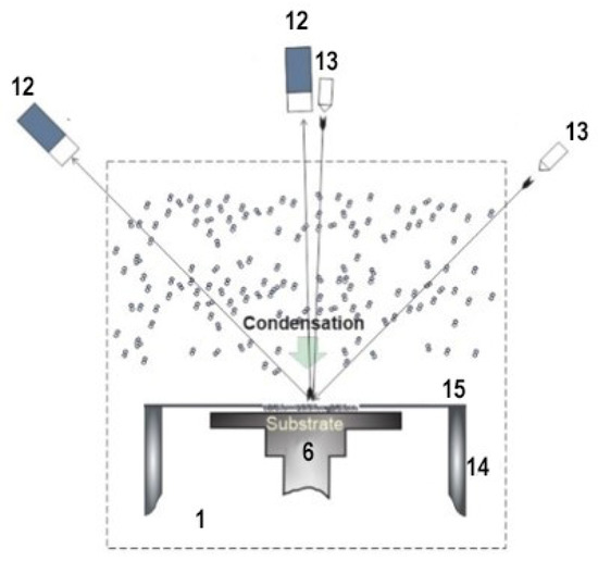 Experimental setup for laser-beam patterning during cryovacuum condensation: 6: substrate, 12: photoelectric multiplier, 13: laser, 1: vacuum chamber, 14: metal cylinder, 15: shield. Number labelling follows that of Figure 3. Reproduced with permission from A.U. Aldiyarov, Refractive Index at Low Temperature of 478 Tetrachloromethane and Tetrafluoroethane Cryovacuum Condensates; published by ACS Omega, 2020 [2].