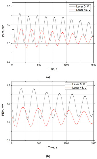 In Figure 5, emitted photoelectron interference patterns (PEM) are generated by a diode laser and two photomultipliers. The measurements were carried out at a frequency of 100 Hz, which makes it possible to determine the oscillation period with an accuracy of ±0.05 s. Then the thin cryofilm thickness d and its refractive index n were measured.