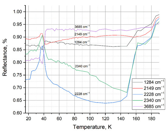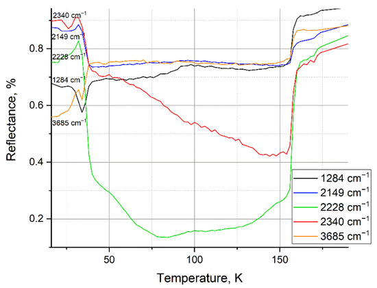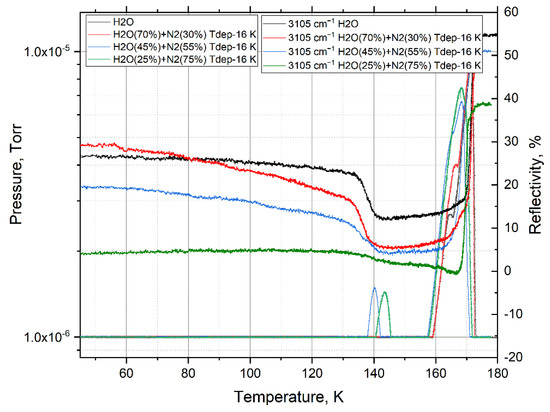 Figure 7 shows the thermograms of the previously mentioned peaks for a mixture of 25% water and 75% nitrogen. From 45 K, the process of nitrogen sublimation from the sample begins and continues until its complete release at 171.6 K. The change in the reflection intensity of the IR spectrum occurs in the range from 42 K to 156 K, which indicates a structural transformation inside the sample as nitrogen is released.