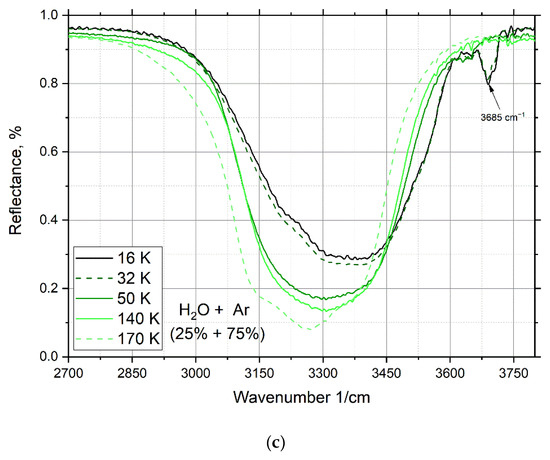 For a mixture of water and argon, the same spectral effect is observed (a peak that is present during condensation and disappears with heating of the cryovacuum film sample). Peaks at 1284, 2149, 2228, and 2340 cm−1 (Figure 8a,b) are also present in the spectrum of the mixture of water and argon, but are less intense than those of the mixture with nitrogen. As with nitrogen, these peaks disappear with the complete sublimation of argon at 172 K. In Figure 8c, for a mixture of water (25%) and argon (75%), a peak appears at wavenumber 3685 cm−1, which disappears when the film is heated to 50 K. However, the mass spectrum fixes (Figure 2b) the presence of argon in the cryofilm of the sample up to a temperature of 172 K.