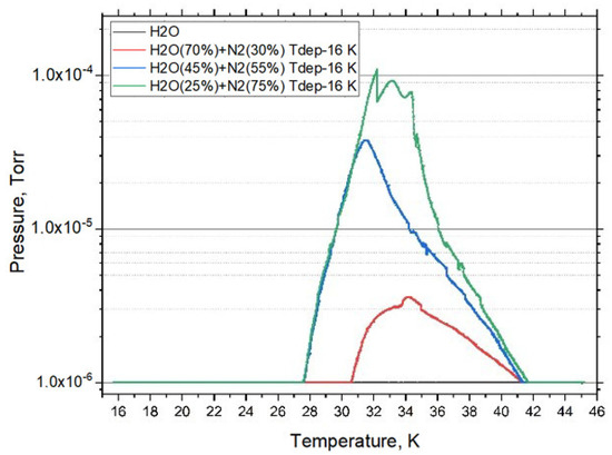 As mentioned earlier, a series of experiments were conducted to determine the influence of mixture concentrations on the escape of nitrogen from the film. Figure 10 shows how the concentration of the mixture affects the change in pressure in the chamber during the first escape of nitrogen from the film during heating. For mixture concentrations (water (45%) + nitrogen (55%) and water (25%) + nitrogen (75%)), the pressure in the chamber increases as the temperature rises to 28 K. As the concentration in the mixture decreases, the onset of nitrogen escape shifts to 31 K (water (70%) + nitrogen (30%)). For all mixture concentrations, most of the nitrogen is sublimed from the sample at 42 K, but not all; the remaining nitrogen leaves the cryofilm sample at 172 K.