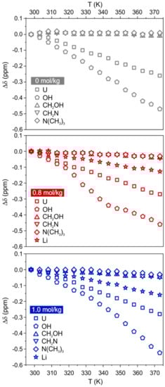 1H and 7Li chemical shift variations of ChCl:U-LiCl(0) (top, grey), ChCl:U-LiCl(0.8) (middle, red), and ChCl:U-LiCl(1.0) (bottom, blue), as a function of temperature. Maximum errors are estimated to be 2% for 1H and 7Li, and 4% for OH protons.