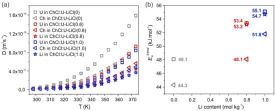 A convenient way to quantify the relative mobility of Li ions with respect to other species in the mixture is via the transference number, which is the fractional contribution of an ion species to the overall conductivity [22]. Indeed, all ions in the system contribute to the total current, but Li ion transport is crucial for the charge/discharge process of LIBs [23]. Under the assumption that all ionic species are free, i.e., ion pairs and/or ion clustering are neglected, an apparent transference number for Li can be calculated from NMR diffusion experiments as given by , with the number of charge carriers [23]. Given the diffusion coefficient of the chloride anion is not directly accessible by PFG-NMR, a Li ion transference number cannot be calculated. However, previous MD simulations in ChCl:U systems found that chloride diffusivity is intermediate between Ch and U [24], with values closer to Ch in the presence of the additional Li cation [14]. Hence, we can define two boundary conditions for by considering equal to the self-diffusion measured for the fastest (U) or the slowest (Li) species (Figure 3), respectively. This gives us the opportunity to estimate the upper and lower transference number of Li ion in this new DES-based electrolyte and compare with other DESs and DES analogs. As observed in Figure 3, estimated ranges for the two samples from 0.04 to 0.09, with a negligible change when increasing the LiCl content. These values are much smaller than those found for type IV DESs composed of lithium bis(trifluoromethanesulfonyl)imide (LiTFSI) and urea or a sulfonamide as HBD ( between 0.4 and 0.7 in the temperature range 298–353 K) [13,25]. values between 0.44 and 0.61 at 30 °C were also reported by Watanabe and coworkers in solvated IL systems consisting of equimolar mixtures of a lithium salt and a glyme [12,26]. However, values found here for ChCl:U-LiCl are in line or even higher than transference numbers found for traditional mixtures of ILs and lithium salts (i.e., in the range 0.02–0.15 are common values for alkyl-imidazolium and alkyl-pyrrolidinium ILs doped with lithium salts [27,28,29]). Therefore, even bearing in mind that apparent transference numbers are only an approximate concept that does not take into account correlated motion of ions, the values found here for the prototypical ChCl:U-LiCl system are probably too low for battery applications at present. The high tunability of DES offers, however, large room for improvement and justify–or even push–further investigations on developing other DEEs.