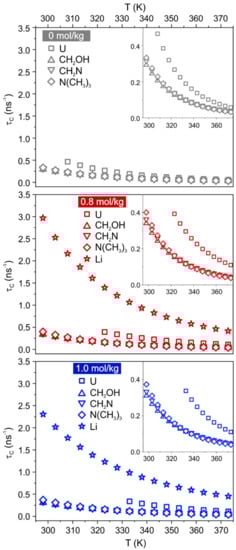 1H and 7Li T1 relaxation times were measured between 298 K to 373 K (Figure S3). Curves of Ch protons pass through a minimum at lower temperature than U protons, while Li curves approach a minimum without reaching it. This is a first indication that Ch protons experience faster local dynamics compared to U and Li. To quantify the rotational motion at each site/species, the Bloembergen, Purcell, and Pound (BPP) model [14,21,30,31,32,33,34,35] was applied to the spin-lattice temperature-dependent relaxation data. The obtained correlation time and apparent activation energy for the rotational motion are reported in Figure 4 and Tables S4–S7. As already observed [14], the T1 curve of U is not reproduced by the BPP model at low temperature, and the divergence gets more pronounced as the LiCl content increases. A good fit of T1 data for urea could be obtained in the interval 308–373 K, 323–373 K and 333–373 K for samples ChCl:U-LiCl(0), ChCl:U-LiCl(0.8) and ChCl:U-LiCl(1.0), respectively. Note, however, that no significant differences are observed in the output parameters when fitting data for ChCl:U-LiCl(0) and ChCl:U-LiCl(0.8) in the reduced interval used for ChCl:U-LiCl(1.0) (Table S4).
