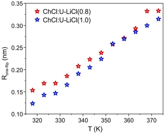 To give a physical interpretation to it has to be considered that the dominant relaxation mechanism is represented here by the quadrupolar interaction. Such interaction arises from the coupling of the electric quadrupole moment –a property of the nucleus– with an electric field gradient (EFG), which is intrinsic to the sample [40]. As reflects the fluctuations of the EFG, and given that the EFG is generated by the surroundings, a reasonable interpretation of is less intuitive than and has to take into account both the local environment of the ion and the deformation of the electronic cloud of the ion itself induced by the surroundings [40]. A simplified model assumes that the first solvation shell plays the dominant role in the fluctuations of the EFG at the nucleus site and, in the specific case of the Li, oscillations of the EFG correspond to the moving of this ion in its solvation cage [41]. In this description, 7Li relaxation would occur by the quadrupolar mechanism for translational motion rather than rotational motion of lithium atom [34,35], and would represent a single lithium jump from one position to another. This allows one to calculate an average distance for a Li one-jump as [34,35]. The estimated average jump distances for the two Li-doped systems investigated here are displayed in Figure 5. values range between 0.10 and 0.35 nm in the temperature window 318–373 K, hence slightly smaller than what previously calculated for the more hydrated parent system comparing the same temperature range [14]. However, the overall similarity of the trends would suggest an analogous Li transport within the mixture, i.e., lithium ions migrating via jumps within the solvation sphere.
