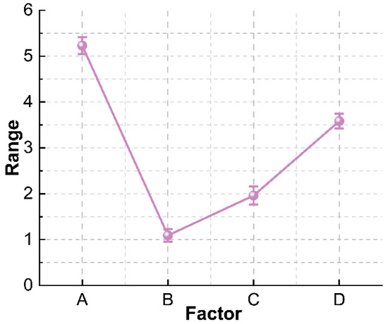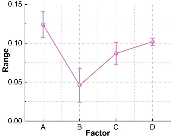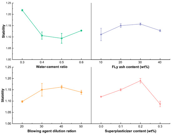 Due to the small inner diameter of the natural gas tunnel and the arrangement of gas pipelines inside it, the slurry should be self-leveling, and therefore self-compacting foam concrete should be used. The self-compacting foam concrete is required to have high stability, which can be characterized by the foaming volume ratio (slurry wet density/dry density). The stability of the foam concrete is better if the foaming volume ratio is close to 1 and there is no segregation and water secretion during the mixing and setting of the slurry [37]. The range analysis is carried out on the stability test results of the orthogonal test, and the stability range analysis trend chart is made according to the range values of each factor, as shown in Figure 5. The results show that the extent of influence of each factor on the stability of foam concrete is water-cement ratio > superplasticizer addition > foaming agent dilution ratio > fly ash addition. The water-cement ratio has the greatest influence on the stability, and the superplasticizer addition and the foaming agent dilution ratio also have a great influence. This result is consistent with the 28 d compressive strength analysis result.
