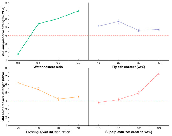 Compressive strength is an important index that affects the application performance of foam concrete. Its low compressive strength is not conducive to providing sufficient support and protection for the pipeline. On the contrary, its high strength will make emergency repair difficult. The range analysis is carried out on the 28 d strength test results of the orthogonal test, and the compressive strength range analysis trend chart is made according to the range values of each factor, as shown in Figure 2. It can be seen that the influential factor in decreasing sequence on the 28 d compressive strength of foam concrete is water-cement ratio > water-reducing agent addition > foaming agent dilution ratio > fly ash addition. The water-cement ratio has the greatest influence on the compressive strength of foam concrete, and the addition of superplasticizer also has a great influence on the compressive strength, while the foaming agent dilution ratio and the fly ash addition have a small influence on the compressive strength. This is because the strength mainly comes from the hydration and hardening of the cementitious material [33].